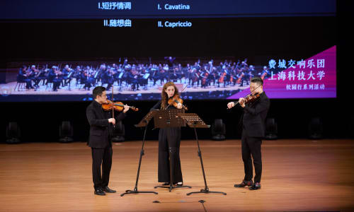Nov. 17, Shanghai: Violinists Daniel Han and Willa Finck and Marvin perform selections from Dvořák’s Miniatures. Photo by Charlie Xia