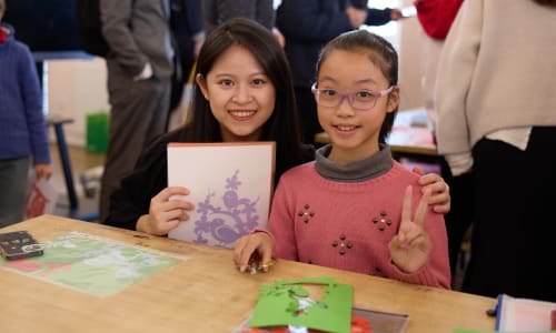 Nov. 18, Shanghai: Yu-Ting receives a paper cutout from a student in the Arts and Crafts Room. Photo by Charlie Xia