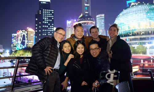Nov. 18, Shanghai: To conclude the 50th Anniversary China Residency, the Philadelphia delegation was treated to an evening cruise around Shanghai. Udi, Mei Ching, Yu-Ting, Marvin, Daniel, Tristan, and Willa pose for a selfie in front of the spectacular Shanghai skyline. Photo by Charlie Xia
