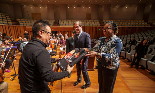 Nov. 10, Beijing: On the 1973 tour, Eugene Ormandy led a rehearsal of the Central Philharmonic Society of China, as the CNSO was formerly known, in Beethoven’s Fifth Symphony (a piece also performed by the Philadelphians on that tour). The two organizations also exchanged gifts. As a symbol of the Orchestra’s gratitude, Matías Tarnopolsky, president and CEO of The Philadelphia Orchestra and Kimmel Center, Inc., and Principal Librarian Nicole Jordan present a score of Beethoven’s Fifth Symphony to Li Xincao, deputy director and chief conductor of the CNSO. Photo by Todd Rosenberg