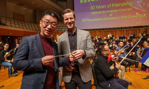 Nov. 10, Beijing: Conducting duties at the concert were shared by Philadelphia Orchestra Assistant Conductor Tristan Rais-Sherman and Li Xincao. Tristan gifts Li Xincao a Philadelphia Orchestra baton. Photo by Todd Rosenberg