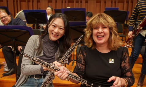Nov. 10, Beijing: Oboe player Elizabeth Starr Masoudnia shares a laugh with the CNSO oboist. Photo by Todd Rosenberg