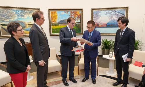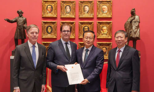 Nov. 10, Beijing: Ambassador Burns; Matías; Sun Yeli, director of the State Council Information Office; and Wang Yongjian, CPC committee secretary, Bureau of International Exchanges and Cooperation, Ministry of Culture and Tourism; hold President Xi’s letter. Photo by Todd Rosenberg