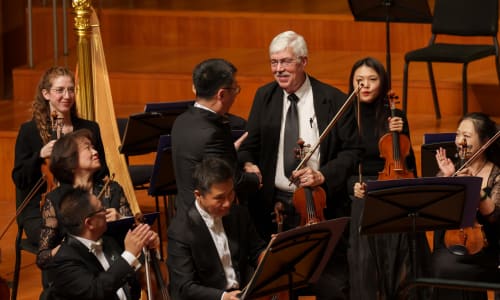 Nov. 10, Beijing: Both conductors stand before the orchestra to acknowledge the audience’s applause. Photo by Todd Rosenberg